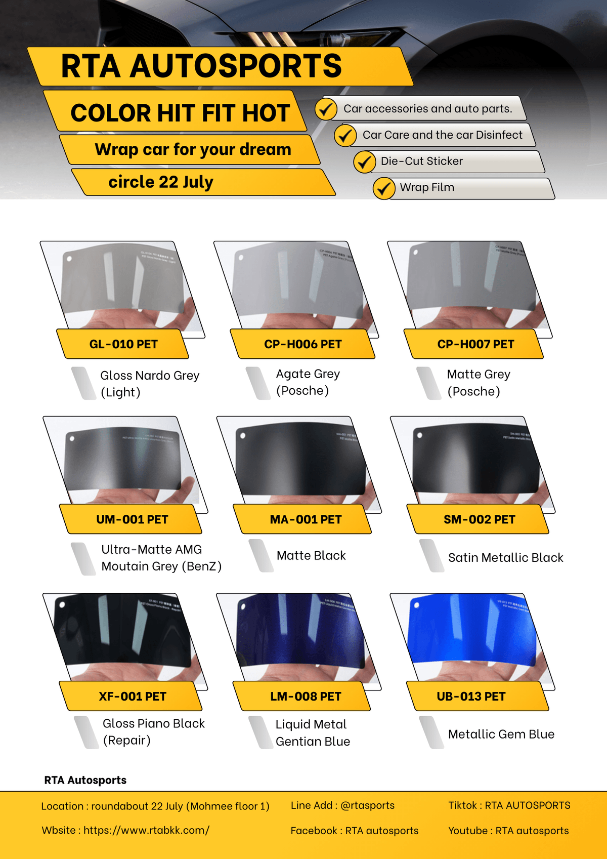RTA Autosports offers a wide variety of wrap films in many colors, including both colored and clear films. Today, we'll be looking at the most popular colors used in Thailand.
